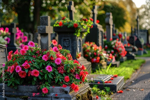 © At My Hat, Fototapeta premium A cemetery with a row of graves and a row of flowers. The flowers are pink and are in vases