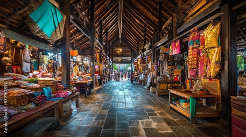 Naklejka premium A centuries-old Thai market hall with wooden beams, stone floors, and intricate wall carvings, filled with local vendors