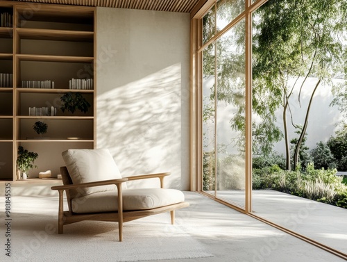 © Bouchra, Obraz premium A chair is in a room with a window. The chair is white and wooden. There is a bookcase in the room