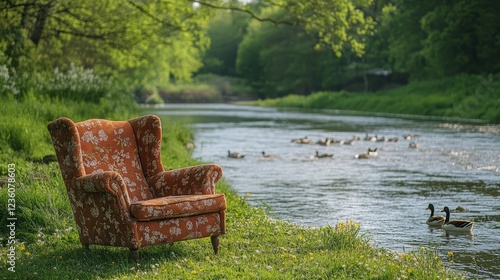 © Aisha, Obraz premium A chair set on a grassy riverside spot in spring, with ducks swimming by