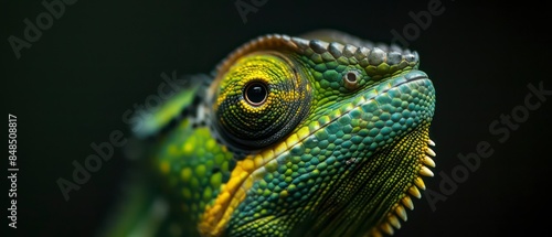 Fototapeta premium a chameleon, a fascinating reptile known for its camouflage and color-changing ability, looks away with its mesmerizing eyes and intricate scales