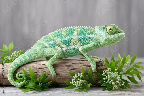 © Thammarong, Obraz premium A chameleon climbing a stick in a terrarium with green foliage