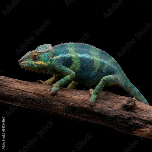 Fototapeta premium A chameleon with green and white coloration is sitting on a branch made of wood