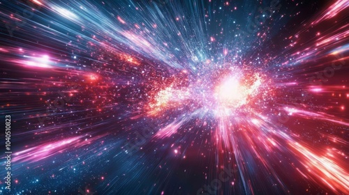 Naklejka premium A chaotic yet beautiful depiction of data flow in a sci-fi setting, with bright neon rays and explosive bursts of color, on a black background