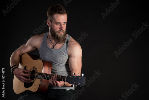 Obraz premium A charismatic man with a beard, playing an acoustic guitar, on a black...