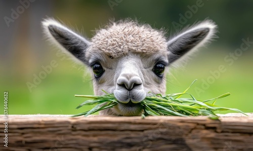 © NovaVision, Fototapeta premium A charming baby alpaca chews grass behind a wooden fence, its big eyes gazing straight ahead.
