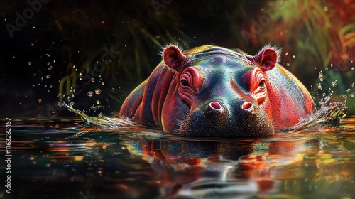 Fototapeta premium A charming baby hippo with vibrant red skin and delicate white accents, resting on a reflective water surface; animated splashes create a dynamic visual.