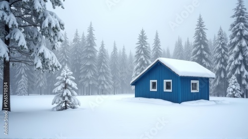 © Nikolaus, Naklejka premium A charming blue cottage stands peacefully amidst a snowy landscape, surrounded by snow-covered trees, embodying the calm beauty of winter.