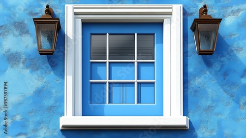 Fototapeta premium A charming blue window framed with white trim, flanked by rustic lanterns, set against a textured blue wall.