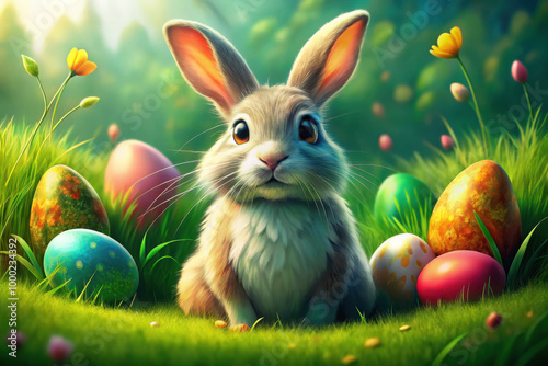 Fototapeta premium A charming bunny explores a colorful Easter egg garden in a serene woodland...