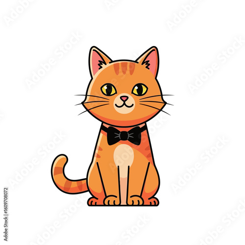 © Disma, Obraz premium A charming cartoon cat with orange fur, a black bow tie, and a happy expression.
