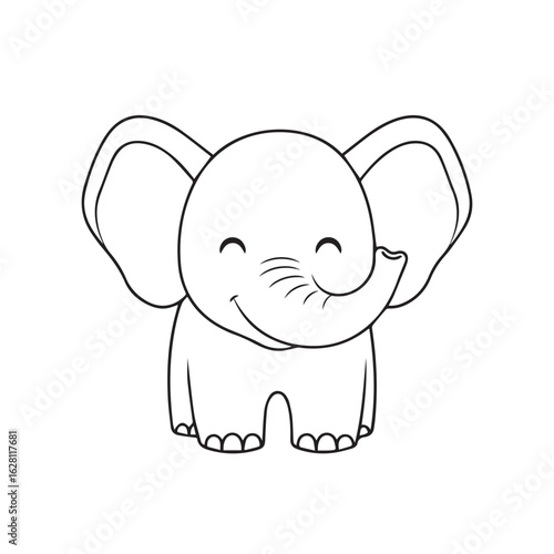 Naklejka premium A charming cartoon illustration of a happy baby elephant with large ears and a curved trunk, presented in a simple outline style.
