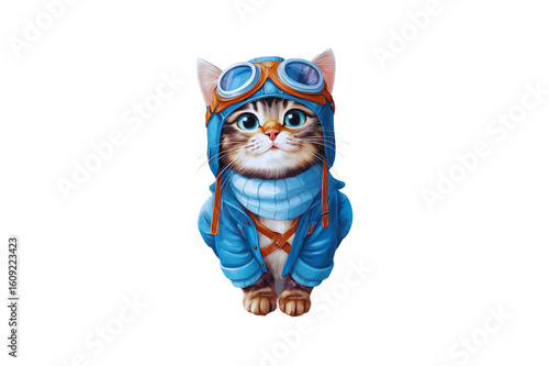 Fototapeta premium A charming cartoon kitten wears a blue aviator hat with goggles and a warm blue jacket sitting upright isolate