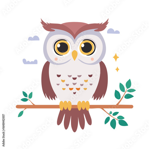 Fototapeta premium A charming cartoon owl with big eyes perched on a tree branch in a whimsical illustration.
