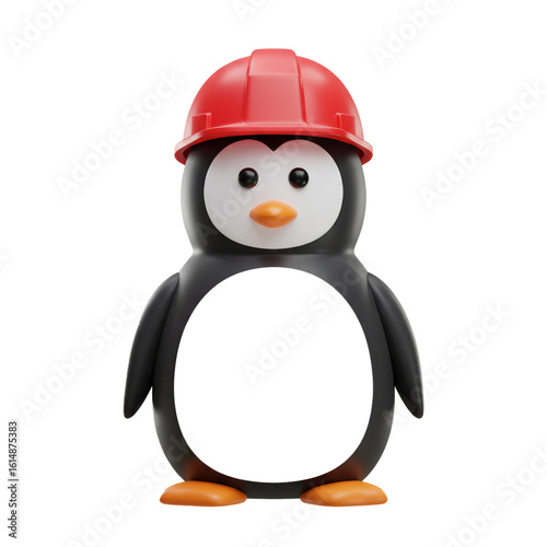 Naklejka premium A charming cartoon penguin wearing a protective red hard hat embodies...