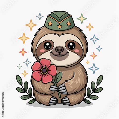 © Joanna Redesiuk, Fototapeta premium A charming cartoon sloth holds a pink flower while surrounded by colorful stars.