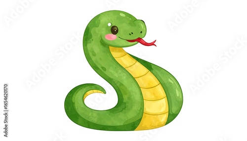 Fototapeta premium A charming, cartoonish snake with bright green and yellow colors, displayed...