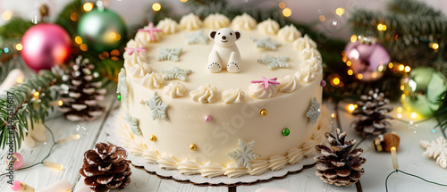 Fototapeta premium A charming Christmas cake decorated with fondant polar bears, delicate snowflakes, and soft white frosting, embodying a winter wonderland theme.