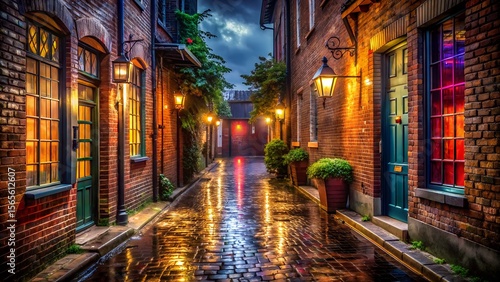 © pixedviszian, Fototapeta premium A charming cobblestone street, illuminated by warm lamplight on a rainy night, creates a cozy and romantic atmosphere