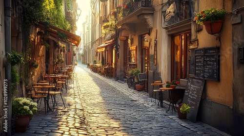 Fototapeta premium A charming cobblestone street lined with cafes, bathed in golden sunlight,...