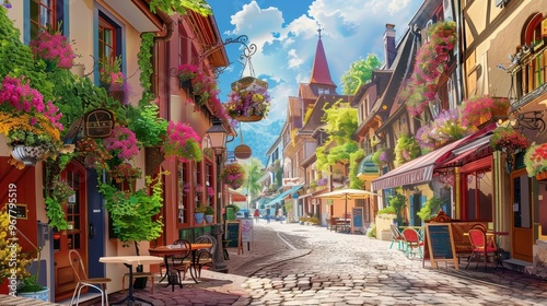 Fototapeta premium A charming cobblestone street lined with colorful buildings and blooming...