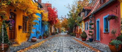Fototapeta premium A charming cobblestone street lined with colorful buildings.Professional photographer perspective