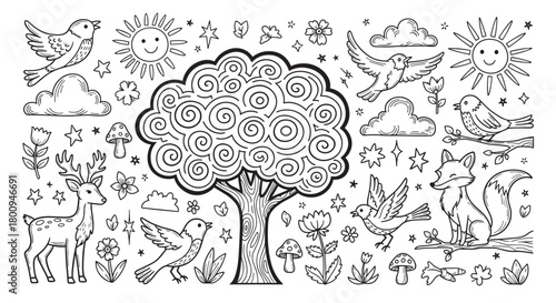Naklejka premium A charming collection of hand-drawn woodland animals and nature elements like a tree, fox, deer, and birds in a whimsical black and white doodle style for coloring