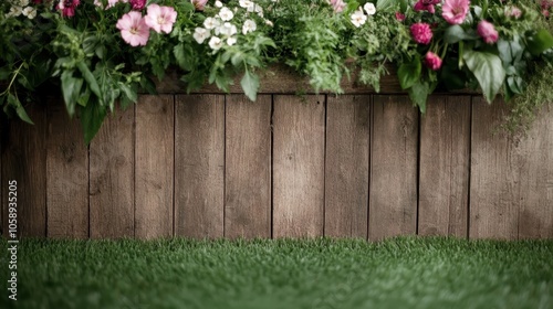 © JoxyAimages, Fototapeta premium A charming, colorful floral arrangement beautifully decorates the area beside a rustic wooden fence, enhancing the outdoor space with nature's vibrant touch.