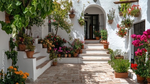 © BerkahStock, Naklejka premium A charming courtyard filled with colorful flowers and plants, inviting relaxation and beauty.