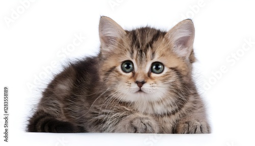 Obraz premium A charming cute kitten stares with captivating eyes against a clean white background. This image captures the innocence and curiosity of a young feline, perfect for cat lovers