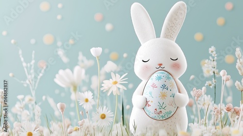 © Natalia S., Obraz premium A charming Easter bunny holding a decorated egg in a picturesque wildflower field. The soft pastel tones and floral details create a whimsical and festive springtime atmosphere