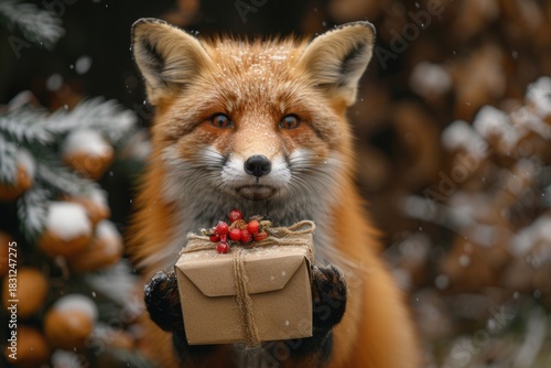 Obraz premium A charming fox delicately holds a gift box adorned with vibrant red berries. This image evokes feelings of warmth, generosity, and festive delight. Suitable for marketing, holidays, and general use.