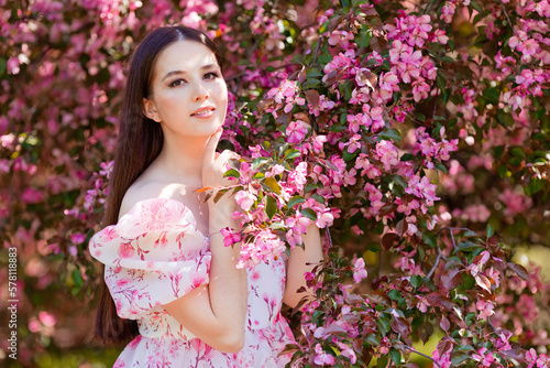 Fototapeta premium A charming girl in a pink dress standing near pink blooming garden