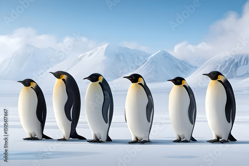 © sornram, Fototapeta premium A charming group of five emperor penguins standing together in a snowy landscape, showcasing their iconic black and white plumage against a serene backdrop.