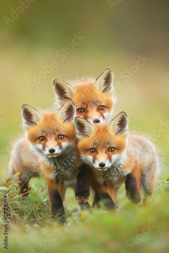 © wolfhound911, Obraz premium A charming group of fluffy fox cubs playfully tumbling in a meadow, their vibrant orange fur contrasting beautifully against the soft green grass.