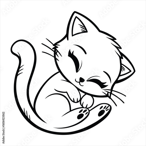 Naklejka premium A charming, hand-drawn black and white silhouette of a cute kitten curled up...