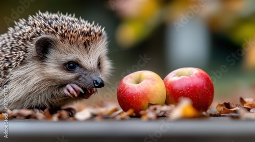 Fototapeta premium A charming hedgehog examines two vibrant red apples amidst fallen colorful...
