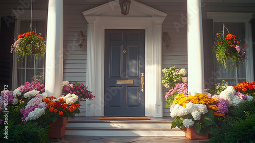 Fototapeta premium A charming house with a blue door, surrounded by colorful flowers in pots, bathed in warm sunlight.