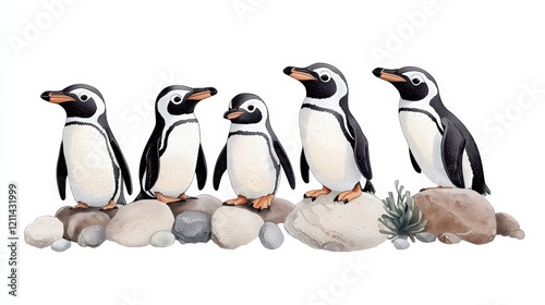 Fototapeta premium A charming illustration featuring five adorable penguins standing among smooth stones, perfect for nature-themed designs.