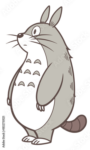 © Nur, Naklejka premium A charming illustration of a large, grey, furry forest spirit character with pointed ears and whiskers, standing upright.