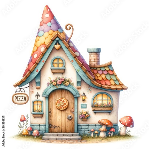 Fototapeta premium A charming illustration of a whimsical pizza house with a colorful roof, inviting door, and surrounding mushrooms, perfect for adding a touch of fantasy and fun to any design.