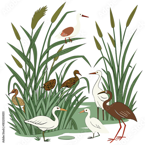 Obraz premium A charming illustration of various wetland birds standing amidst tall green reeds and cattails