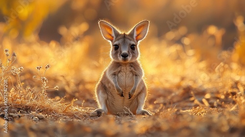 © kanesuan, Fototapeta premium A charming image of a baby kangaroo peeking out from its mother pouch in the Australian outback. The mother strong presence and the baby’s curious gaze are highlighted against the backdrop of the