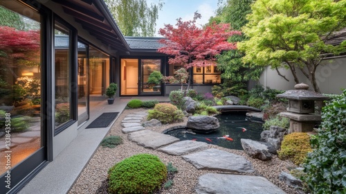 © Plaifah, Fototapeta premium A charming Japanese garden visible from a living room, featuring a stone path, manicured shrubs, and a small bridge over a koi pond, emphasizing tranquility.