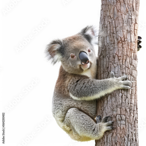 Naklejka premium A charming koala bear clinging to a eucalyptus tree, isolated on white background