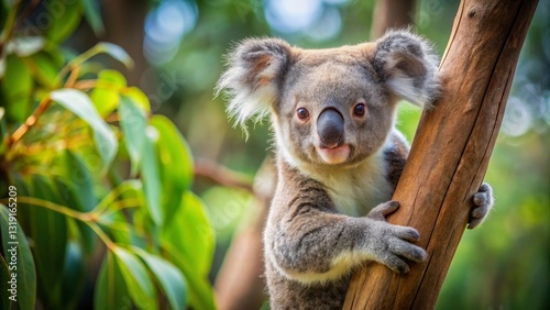 © Dounghathai, Obraz premium A charming koala clinging to a tree trunk in a lush green forest habitat