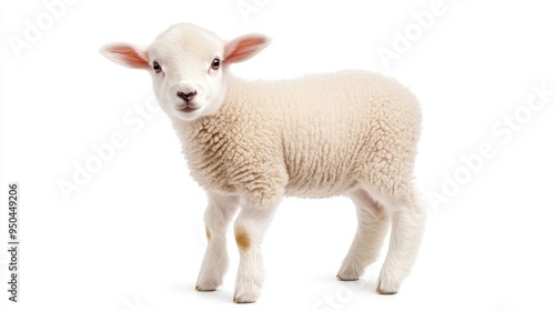 © pvl0707, Fototapeta premium A charming lamb gazes curiously at the camera against a soft white background in a captivating full-body shot
