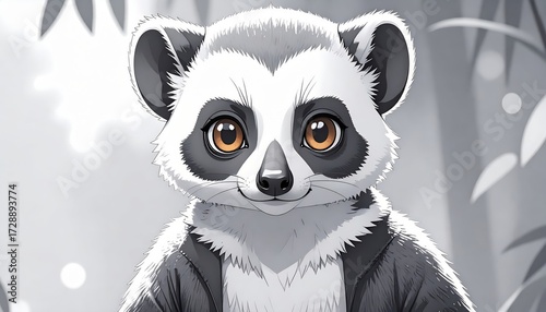© Zevania, Fototapeta premium A charming lemur with striking amber eyes gazes from within a grayscale jungle scene.