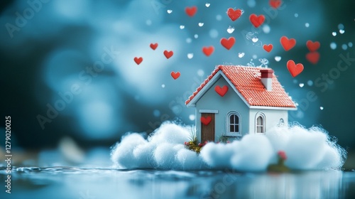 Naklejka premium A Charming Little House Surrounded by Hearts and Clouds