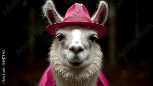 © Gina, Naklejka premium A charming llama portrait, donned in a vibrant pink fedora, and matching cloak